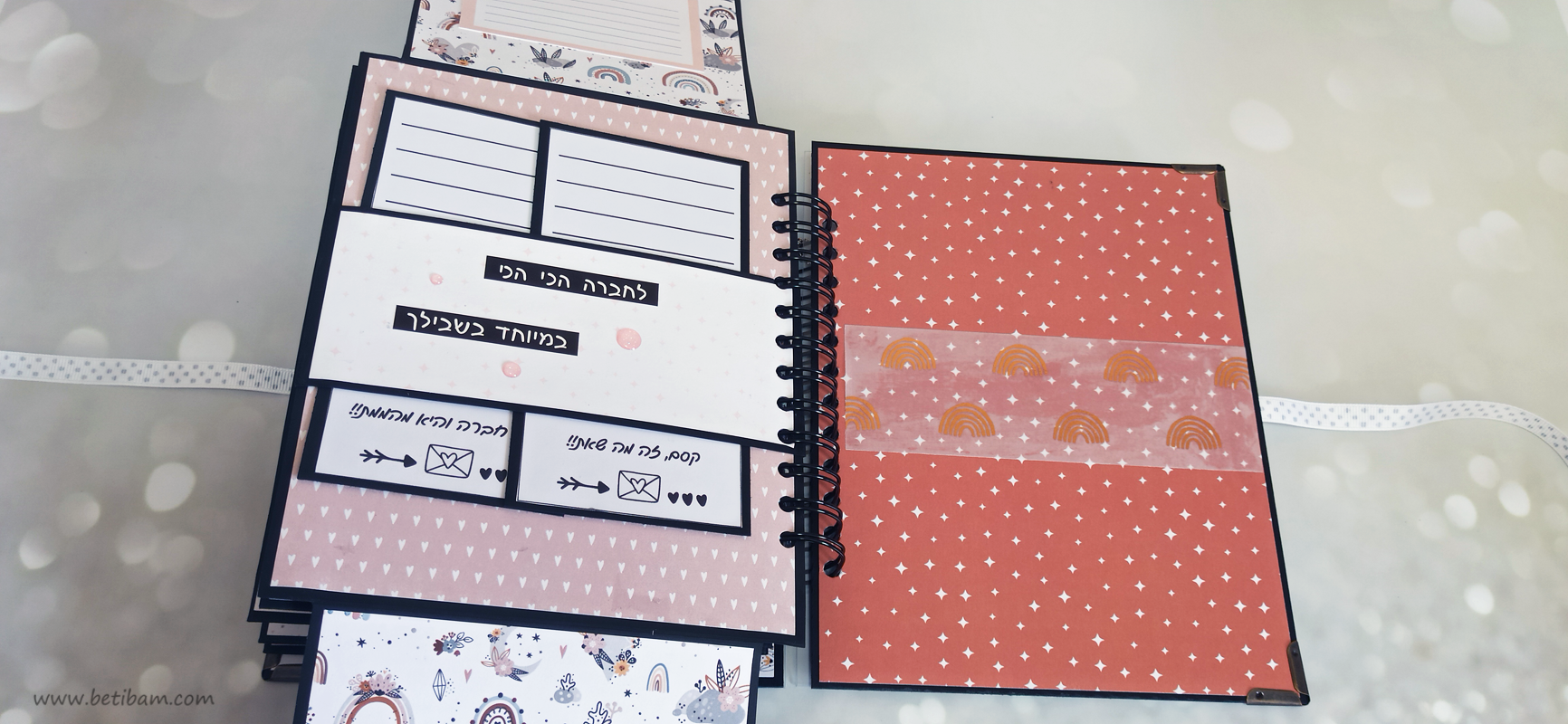 לאור הבקשה, אני החלטתי להשאיר את האלבום בגודל של מחברת, אבל עם עיצוב שהוא יותר אלבום ברכות קטן, לכן גם השארתי את הכריכה ככריכת ספירלה כיפית.