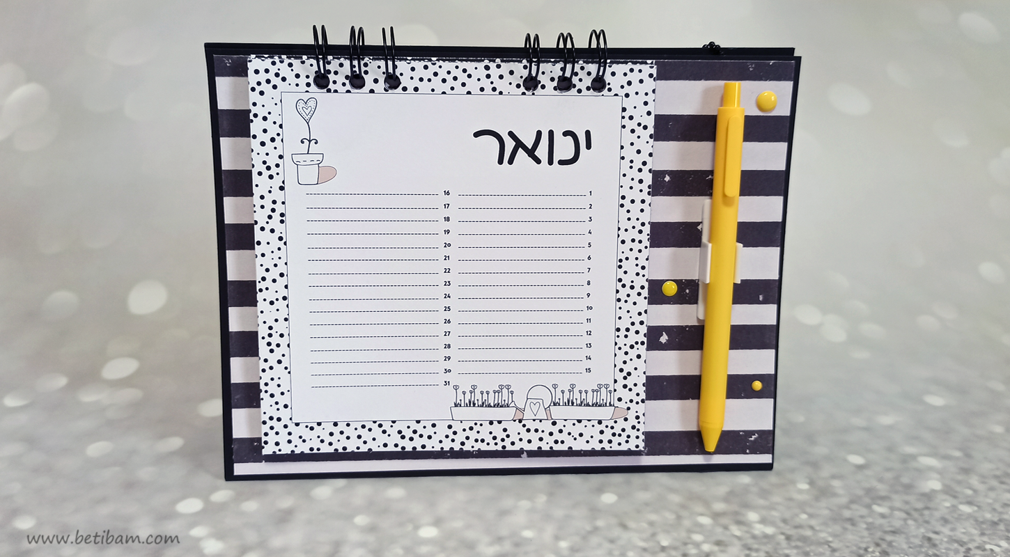 לוח שחור לבן מעוצב כולו מהסטאק BW Doodles, הפעם כל חודש עם רקע שונה ומגניב, מעוצב כלוח שולחני עומד עם עט משולב ושרשרת עיצובית מאחור.