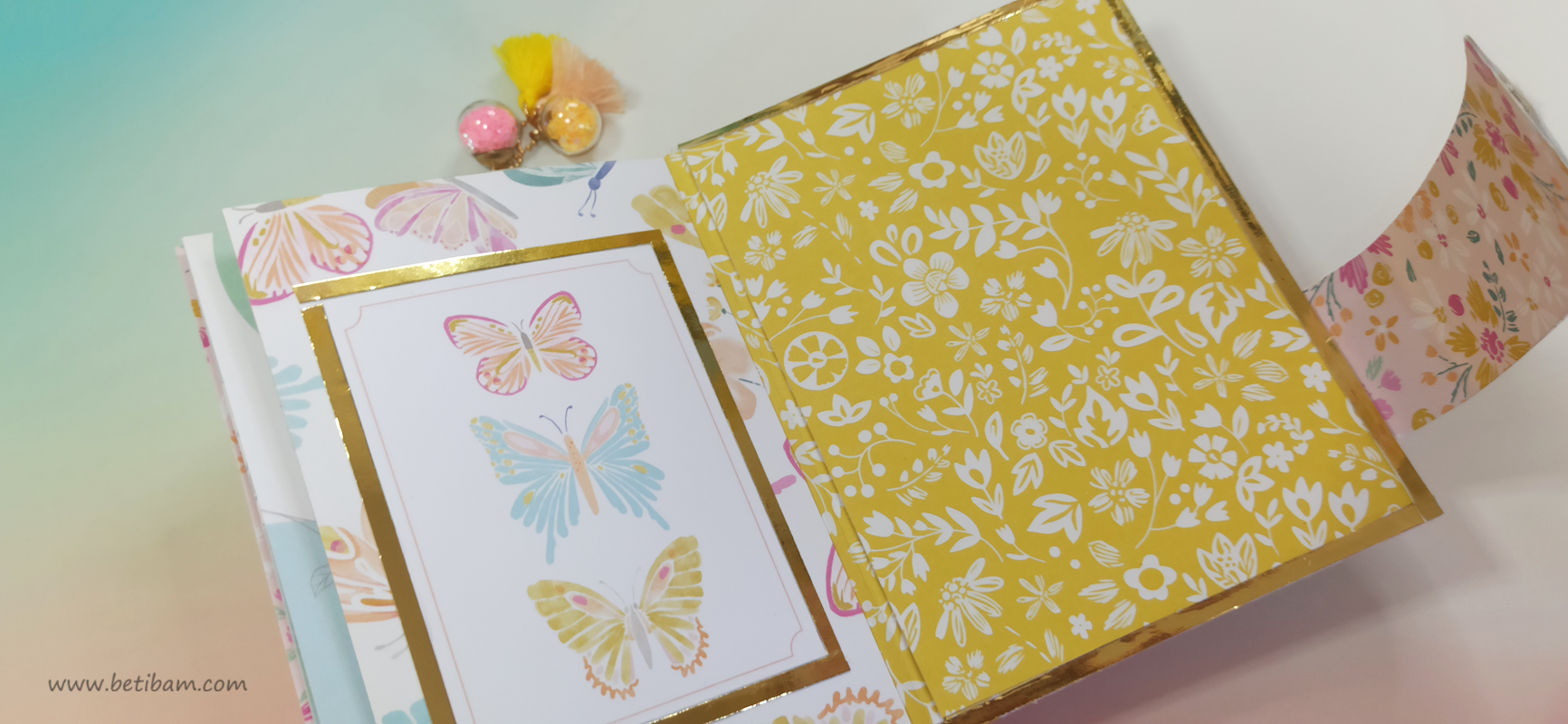כריכה בשילוב צ'פבורדים, ושקף בשדרה מעל חיתוכי פרחים שמודבקים על נייר מדוגם, עם שילוב שרשרת זהב עם חרוזים וטאסלי רקמה.