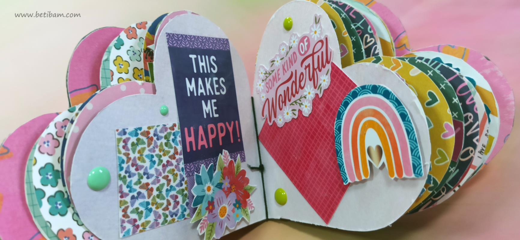 בחוטי הגומי משולבים חרוזים וטאסלים, עיצוב הכריכה בשילוב קשת בענן מחוטי מקרמה. האלבום מעוצב בכרטיסיות מתוך הסטאק עצמו שתפרתי גם אותן, בשילוב מדבקות, וולום ונקודות דביקות.