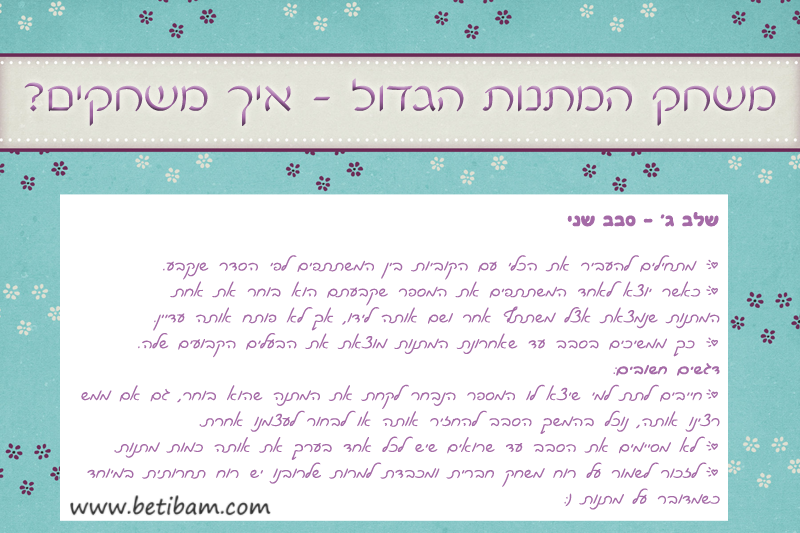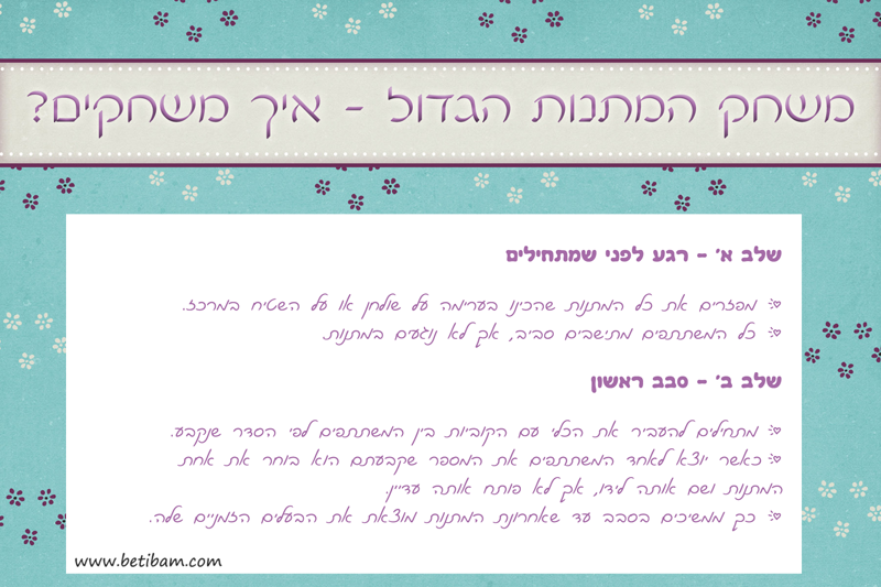 מתנות - תמיד אפשר לארגן לבד, אבל אם במשחק משתתפות מס' משפחות או קבוצה של חברים שאינם ילדים 😉 ניתן להחליט על תקציב מסוים של עד סכום ולשלוח כל אחד לדאוג למס' מסוים של מתנות