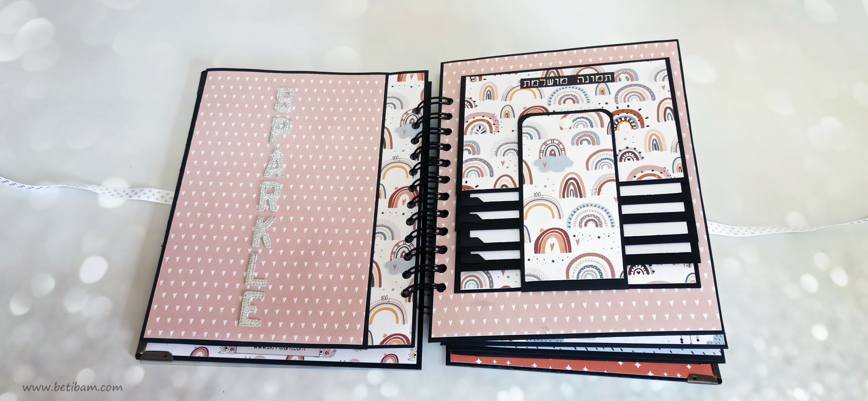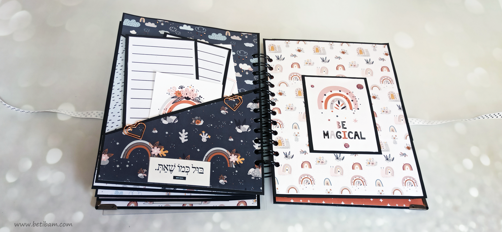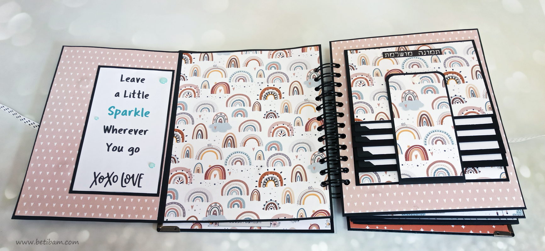 כרכת ספירלה שחורה שמתאימה בול לצבעים הנבחרים, שקפים משני הצדדים להגנה על האלבום, שילוב של סרט לסגירת האלבום שקצת עקב הגודל התפוצץ לו :) ותוספת של חרוזים שתמיד מקפיצים.