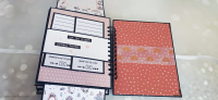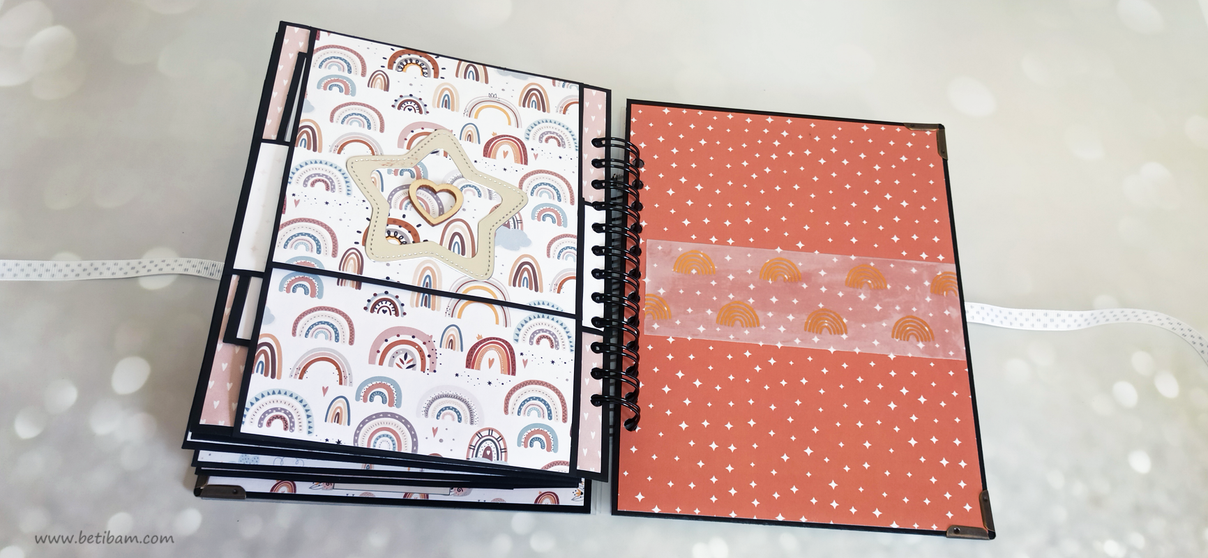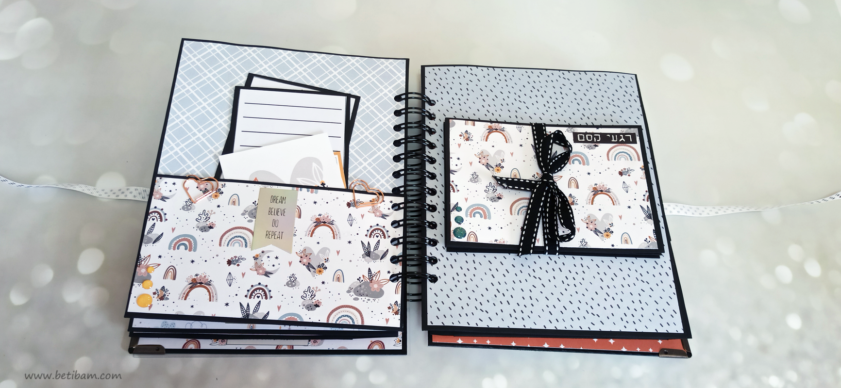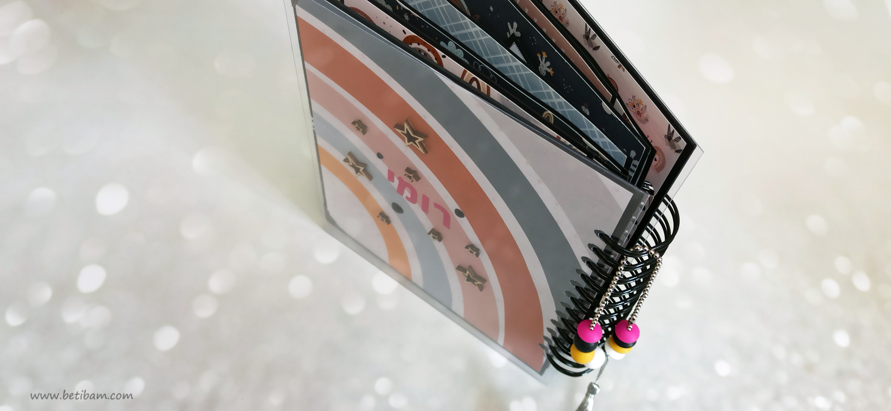 כרכת ספירלה שחורה שמתאימה בול לצבעים הנבחרים, שקפים משני הצדדים להגנה על האלבום, שילוב של סרט לסגירת האלבום שקצת עקב הגודל התפוצץ לו :) ותוספת של חרוזים שתמיד מקפיצים.
