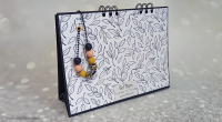 לוח פרחוני מעוצב כולו מהסטאק Boho Garden Party, מעוצב כלוח שולחני עומד עם עט משולב ושרשרת עיצובית מאחור.