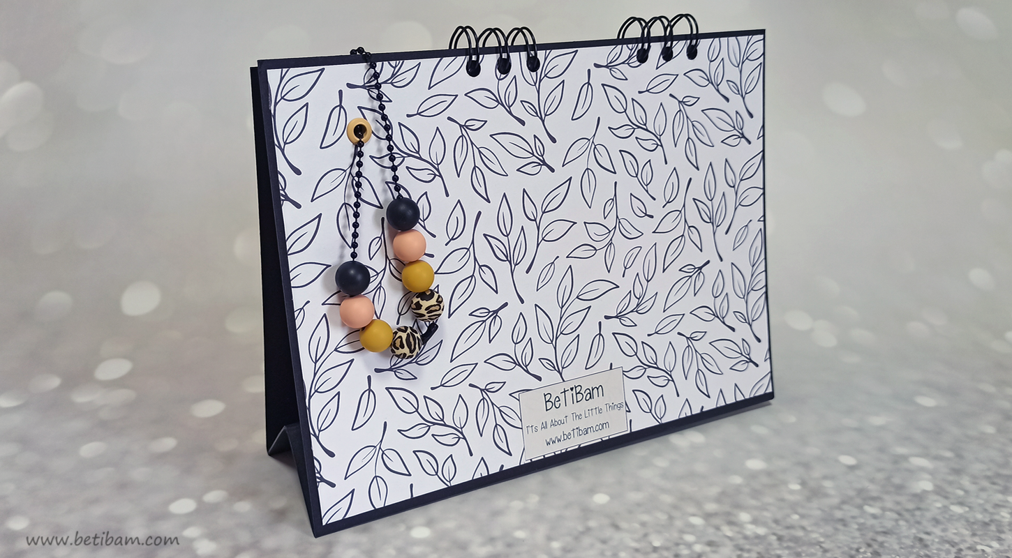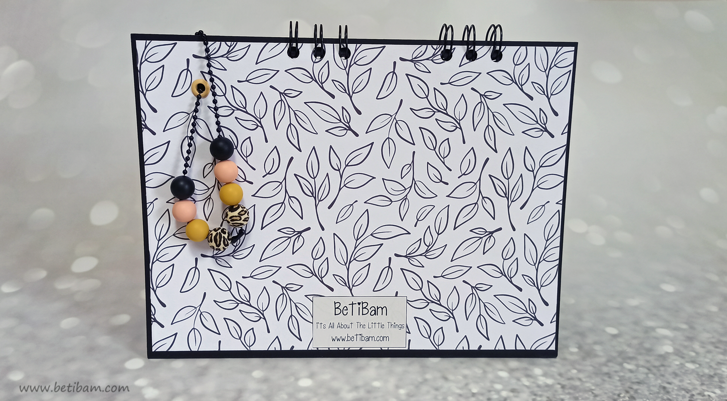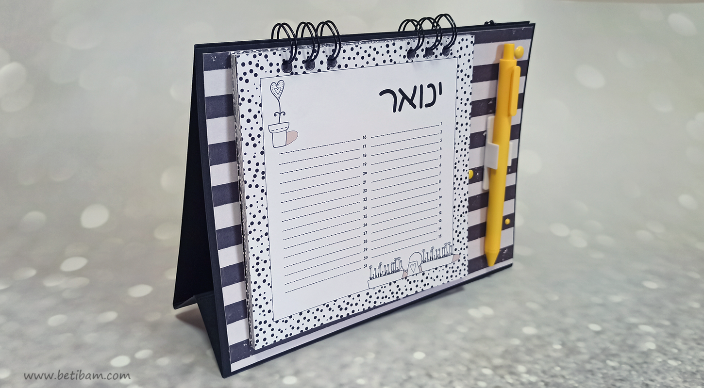 לוח שחור לבן מעוצב כולו מהסטאק BW Doodles, הפעם כל חודש עם רקע שונה ומגניב, מעוצב כלוח שולחני עומד עם עט משולב ושרשרת עיצובית מאחור.