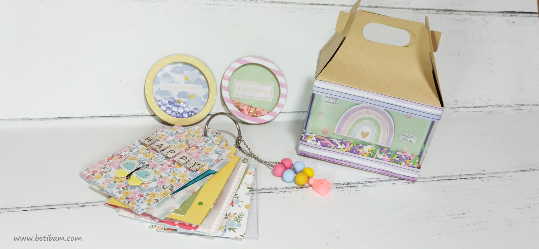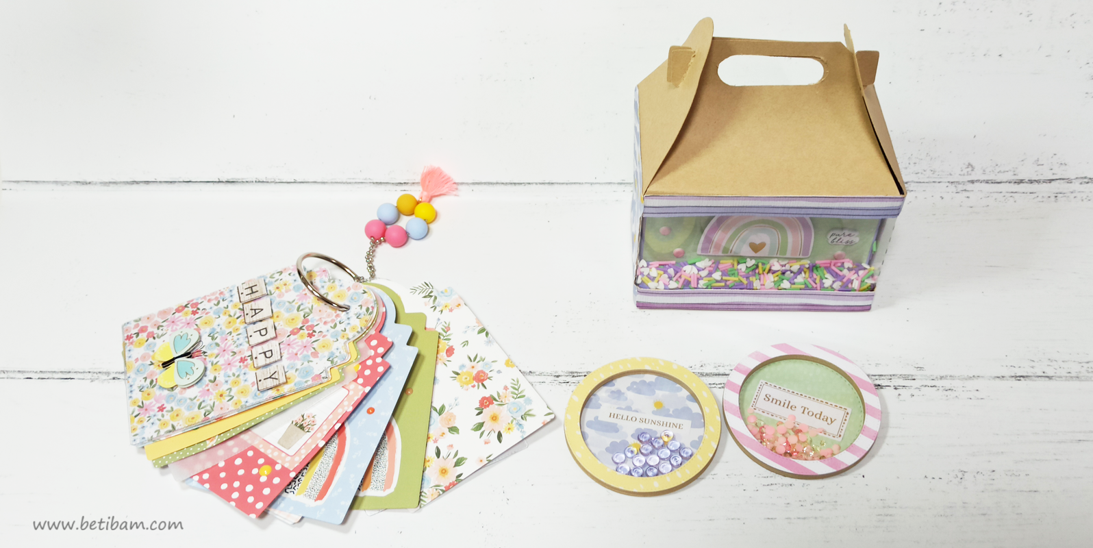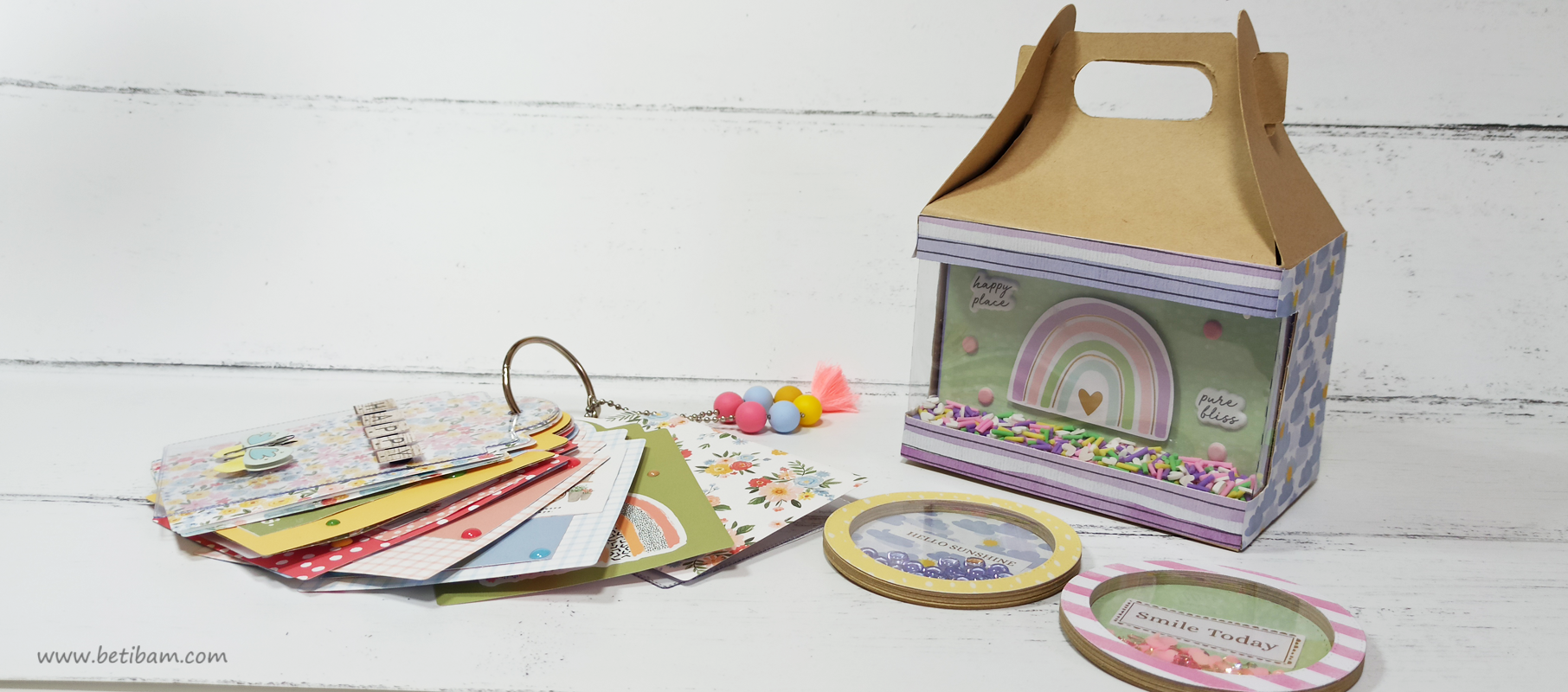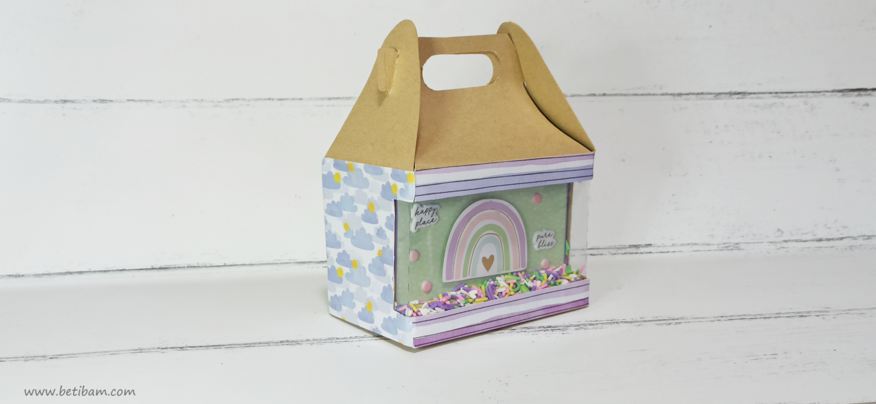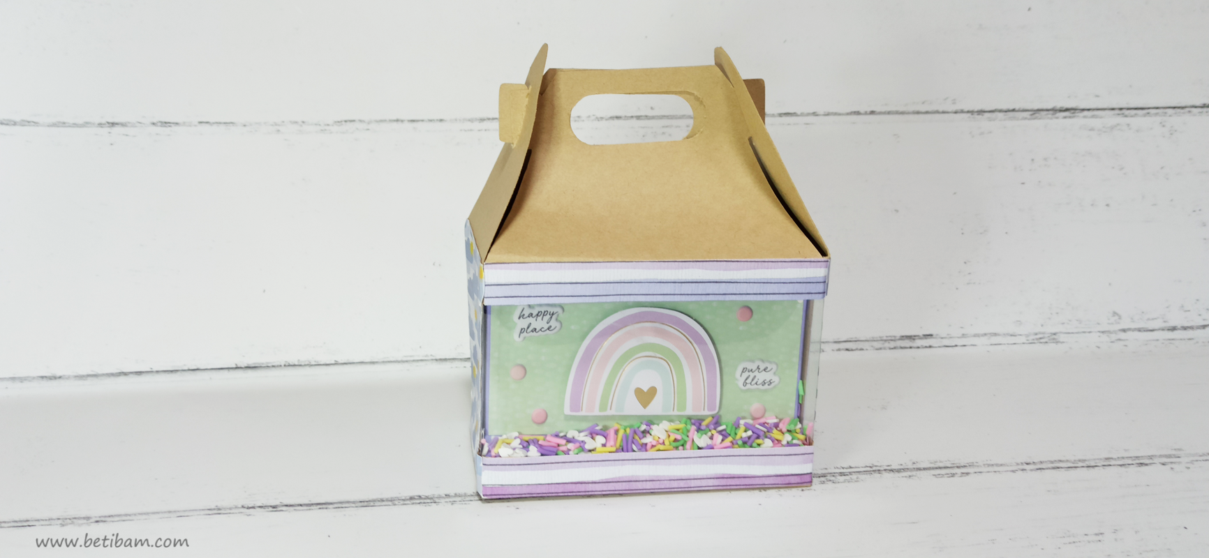 קופסת חלון שהיא גם שייקר, בסיס קראפט ועיצוב בניירות מדוגמים וקישוטונים מהקולקצייה של Rosie's Studio - Brand new day,