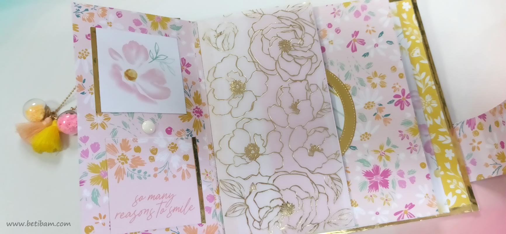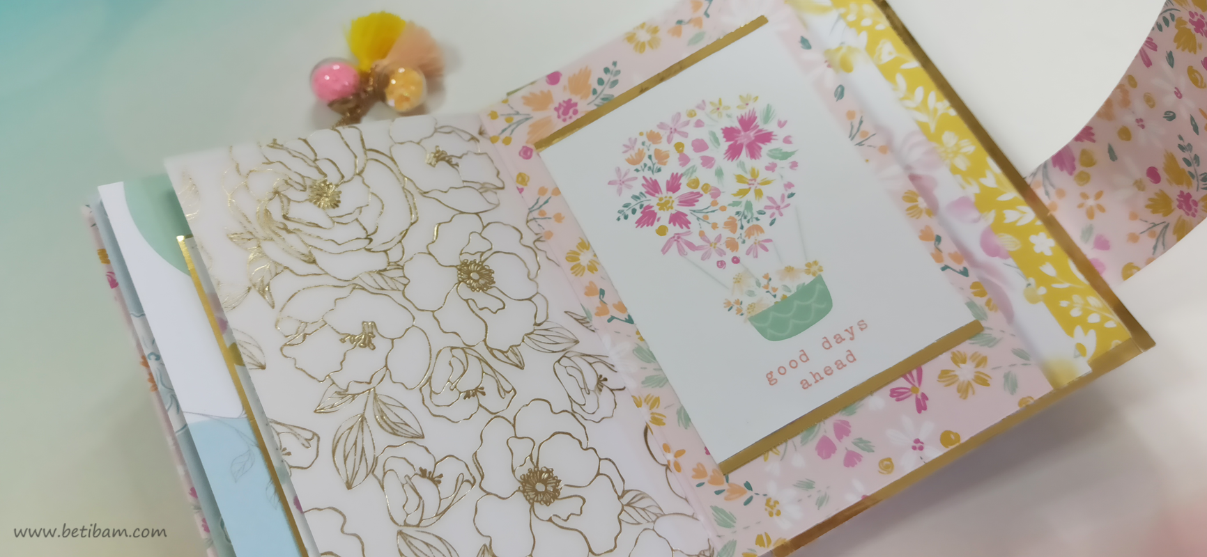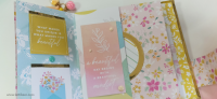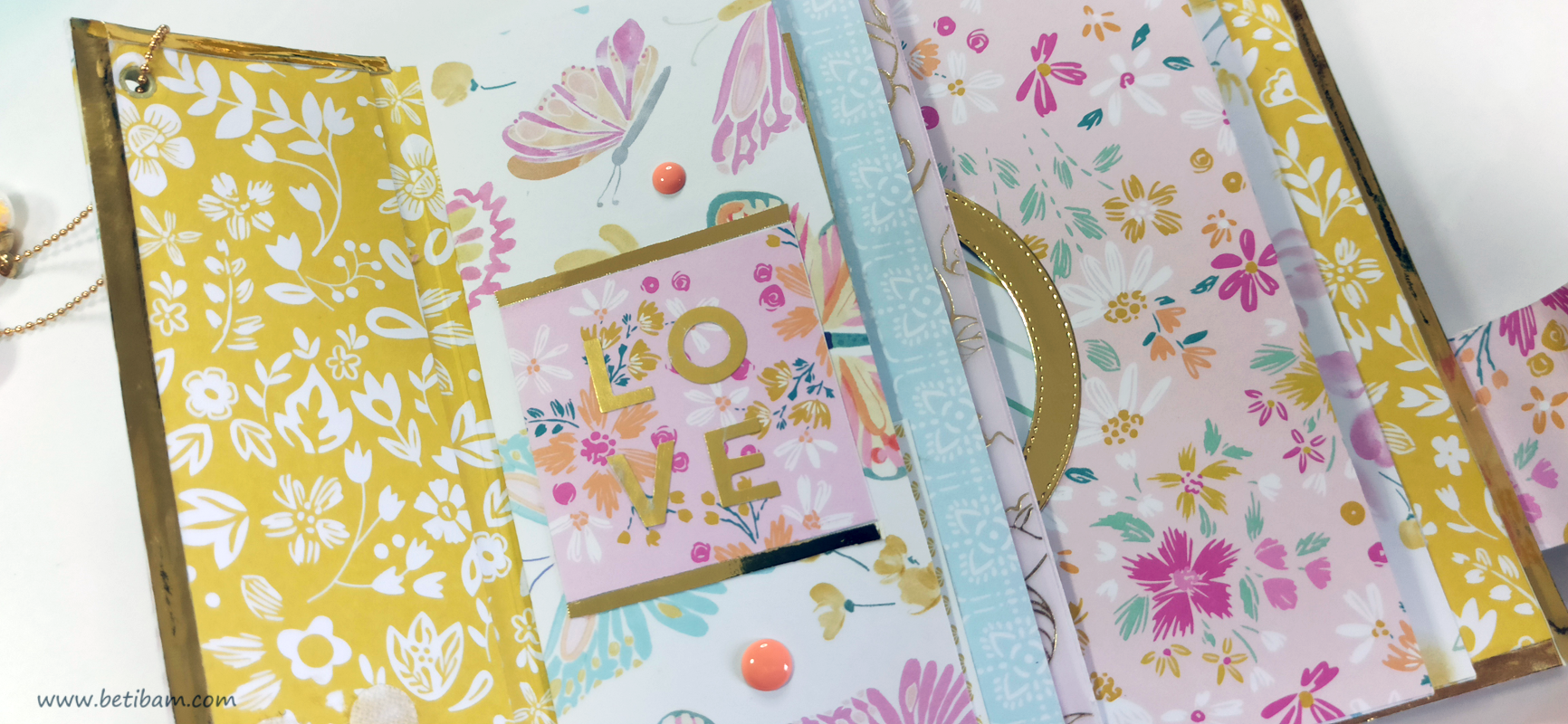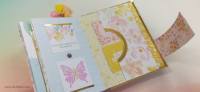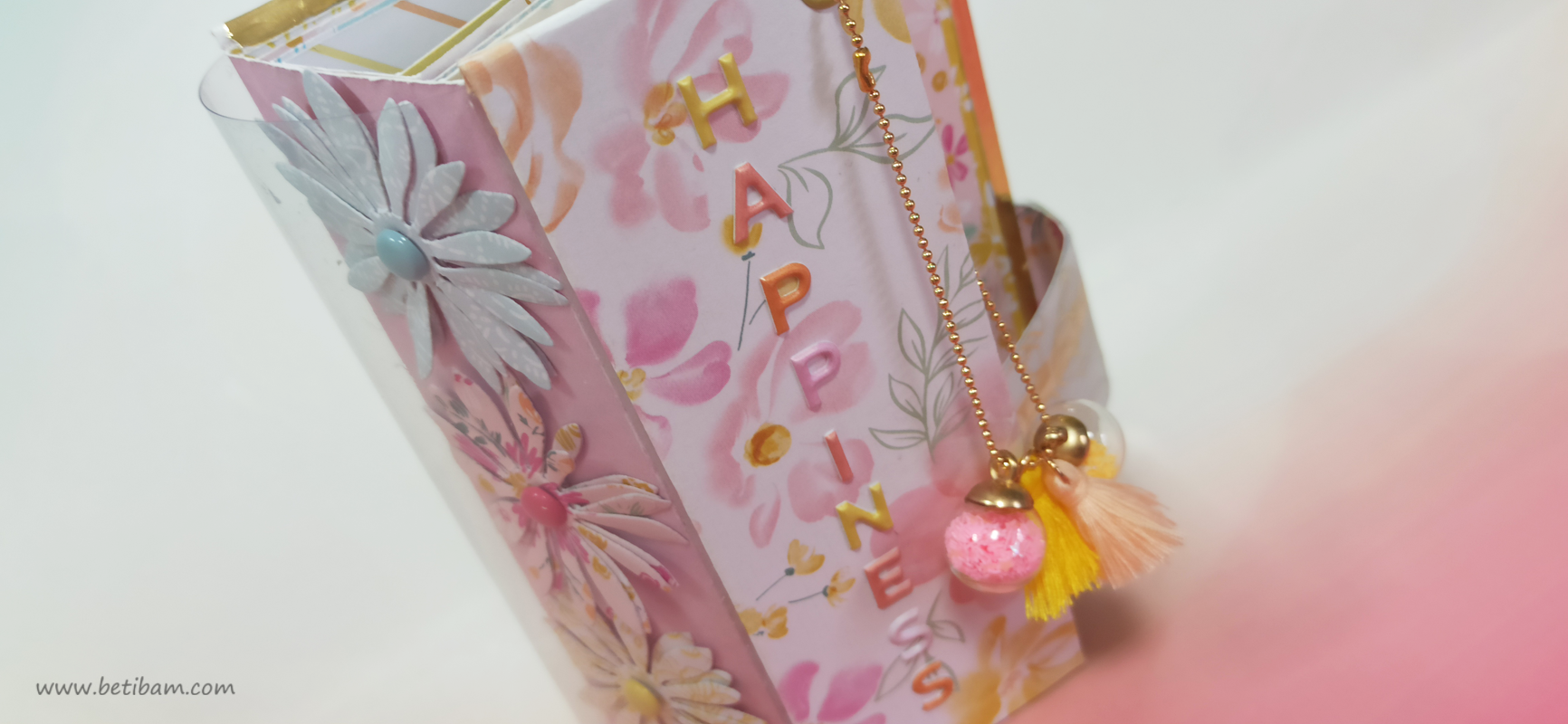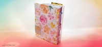 כריכה בשילוב צ'פבורדים, ושקף בשדרה מעל חיתוכי פרחים שמודבקים על נייר מדוגם, עם שילוב שרשרת זהב עם חרוזים וטאסלי רקמה.