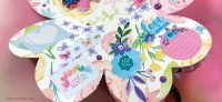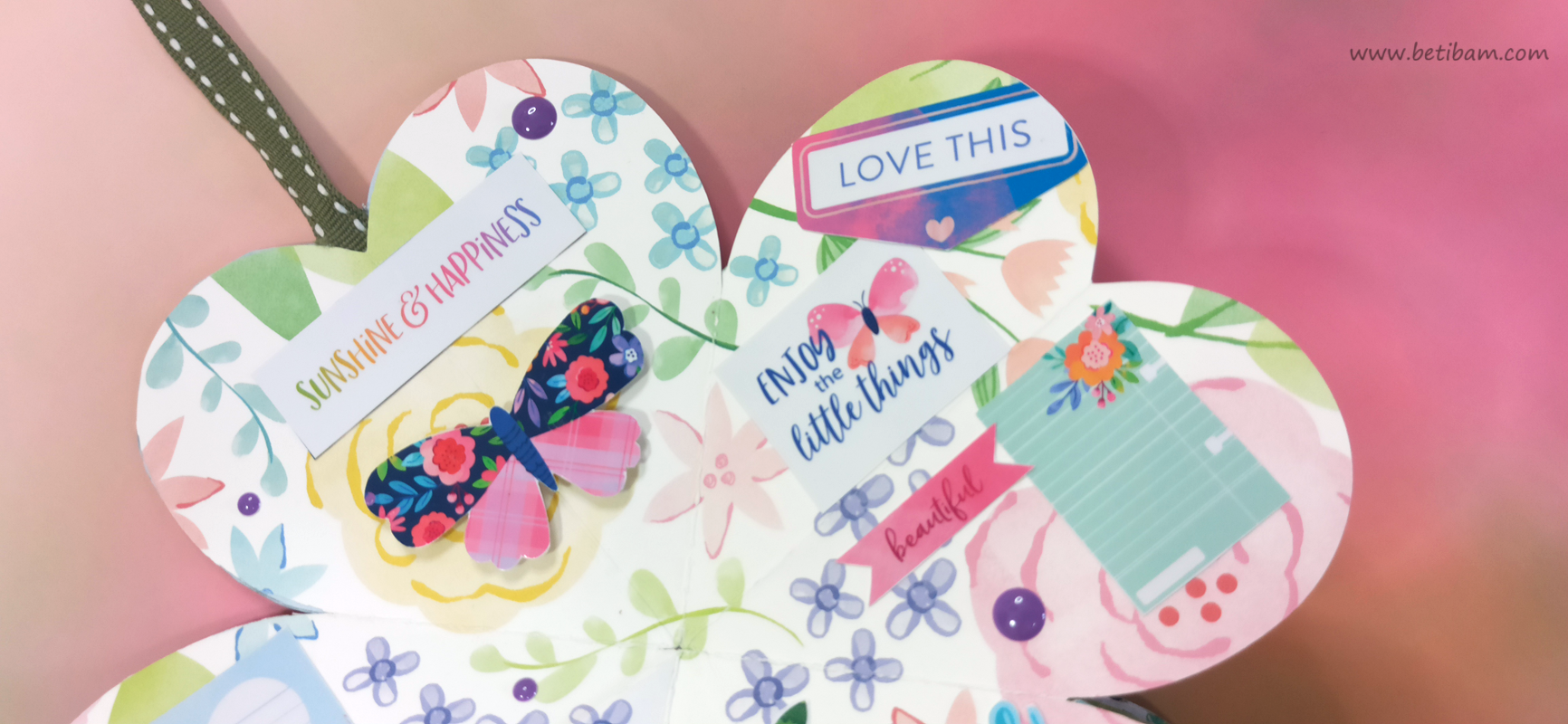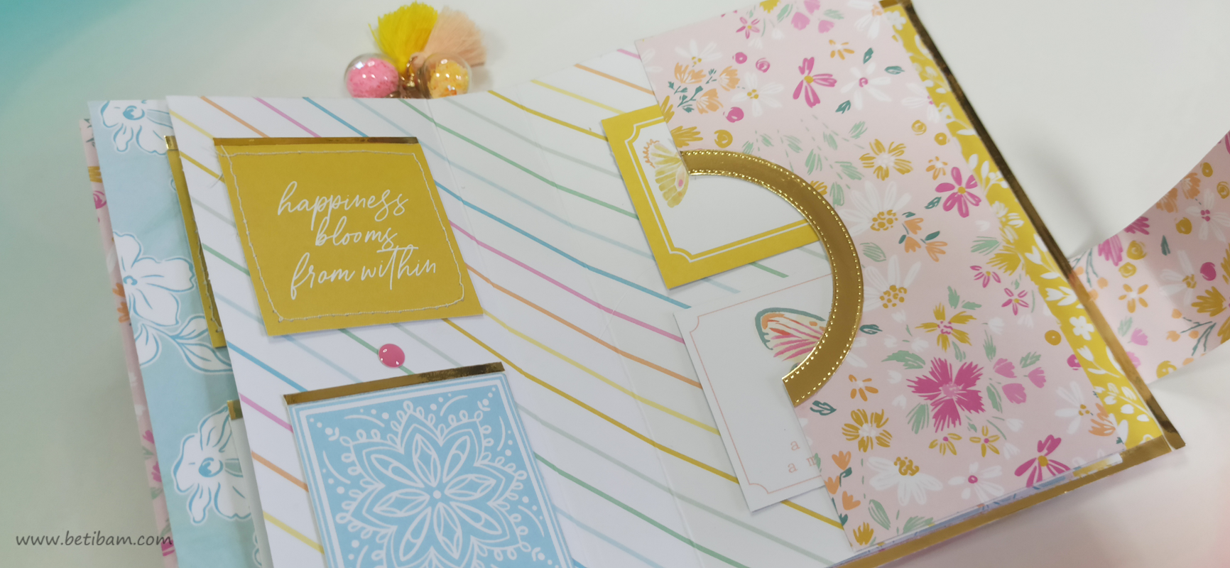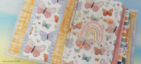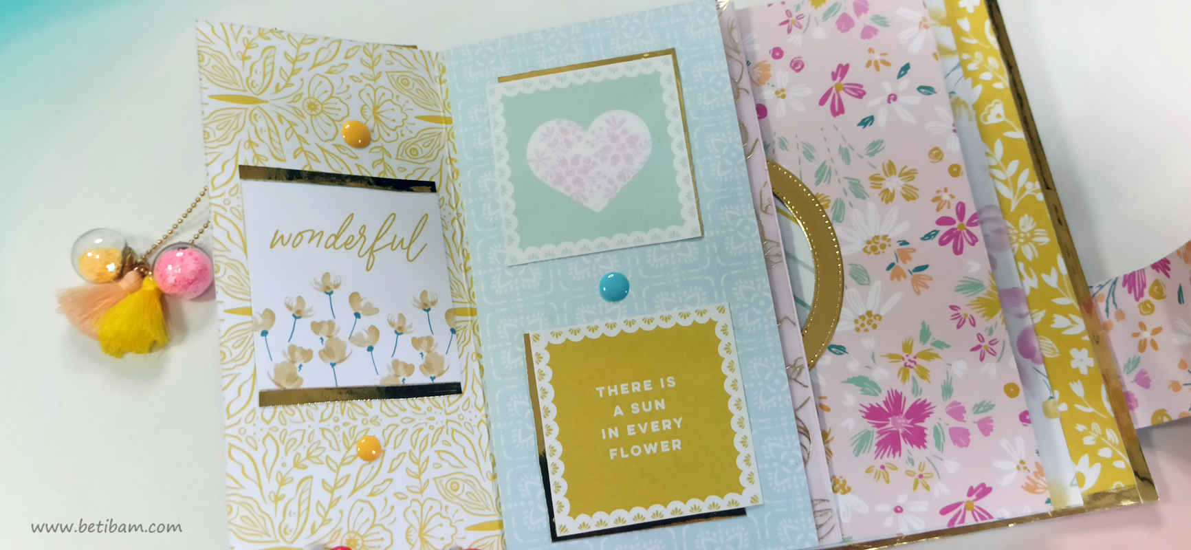 כריכה בשילוב צ'פבורדים, ושקף בשדרה מעל חיתוכי פרחים שמודבקים על נייר מדוגם, עם שילוב שרשרת זהב עם חרוזים וטאסלי רקמה.