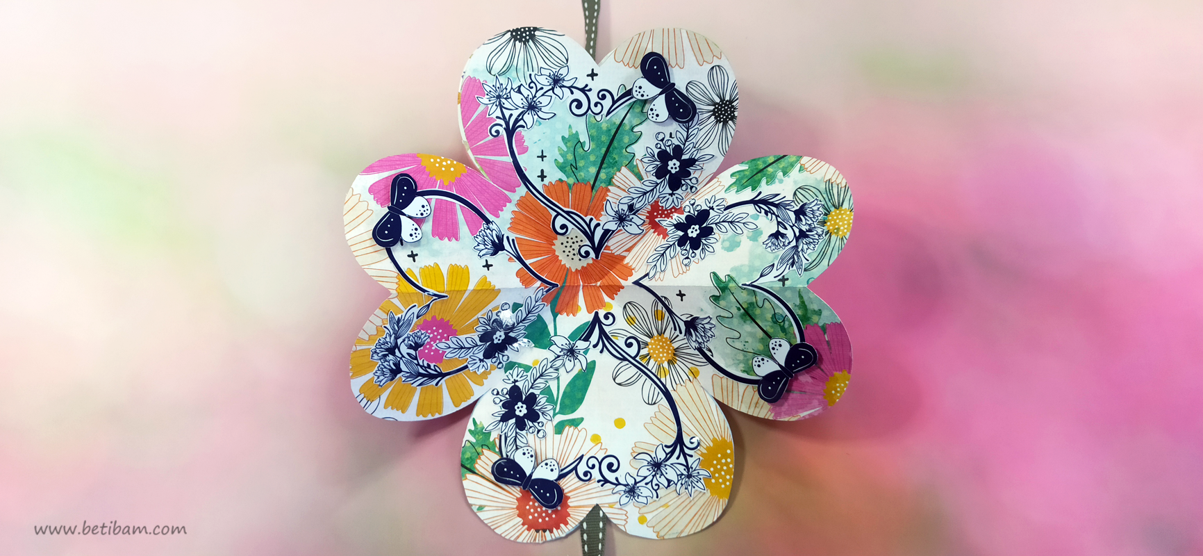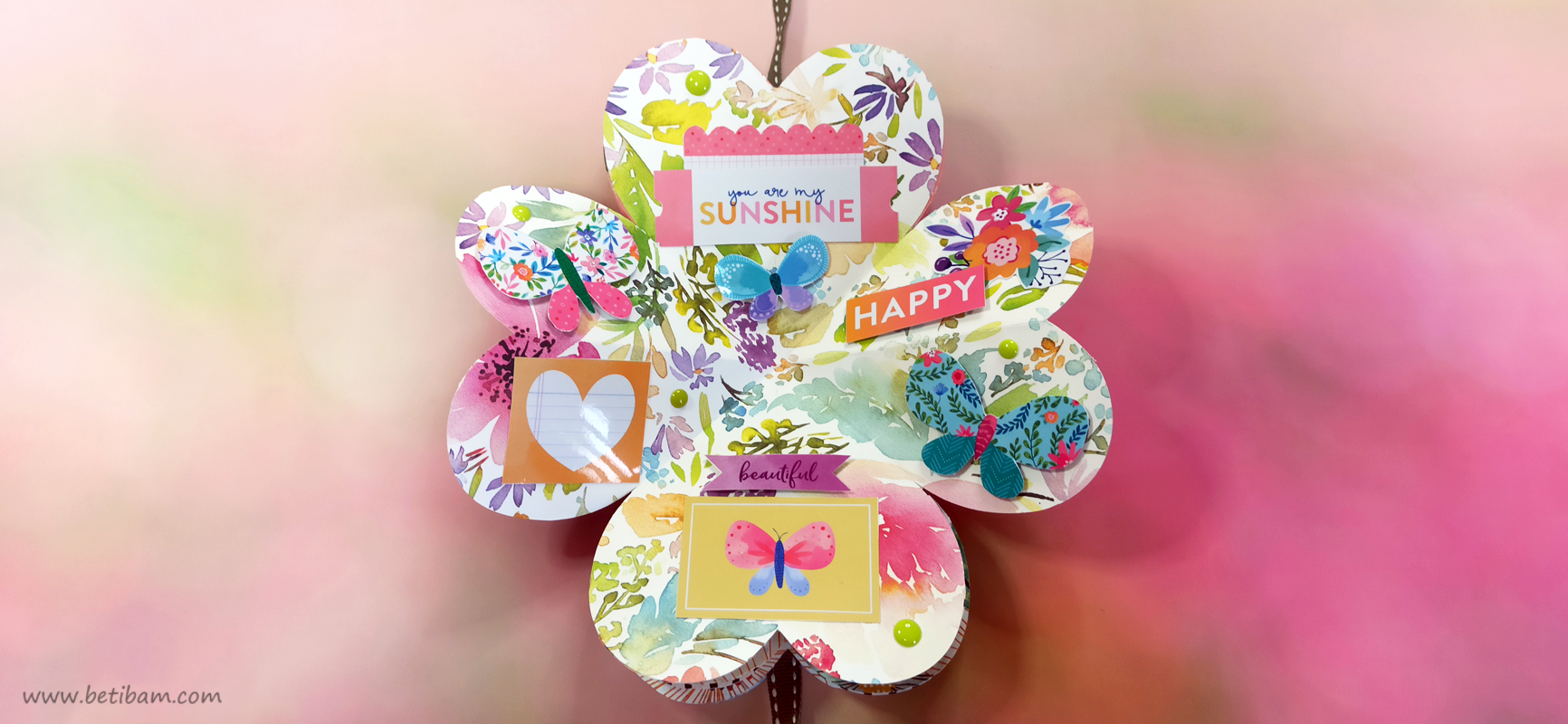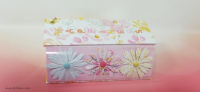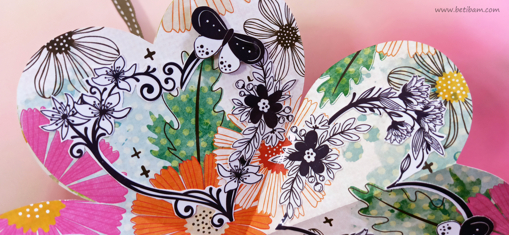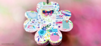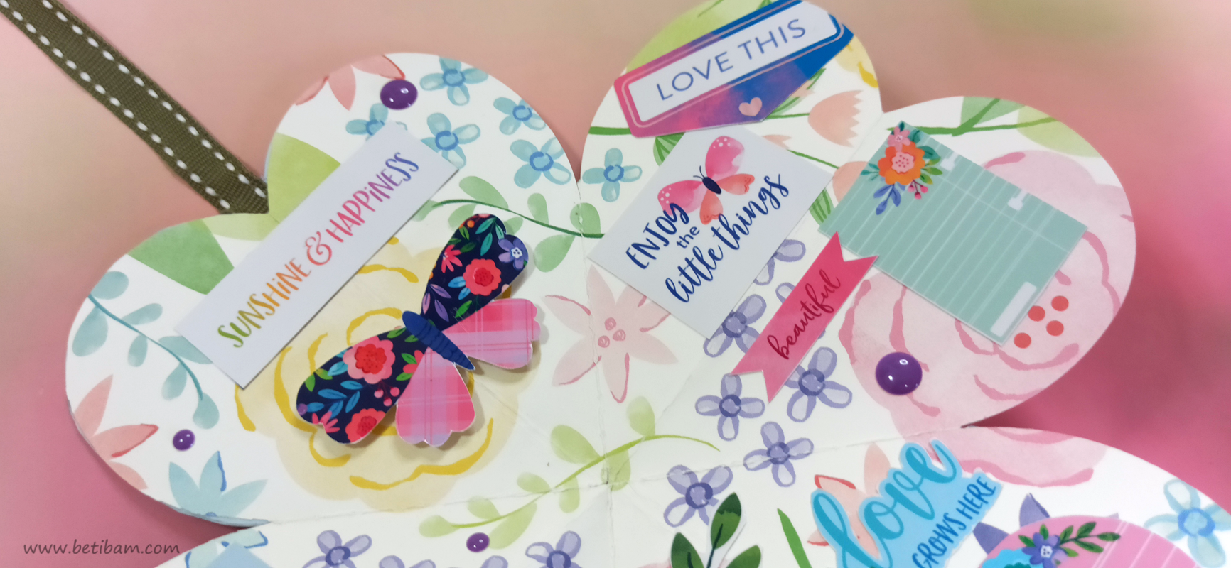 כריכה בשילוב צ'פבורדים, ושקף בשדרה מעל חיתוכי פרחים שמודבקים על נייר מדוגם, עם שילוב שרשרת זהב עם חרוזים וטאסלי רקמה.