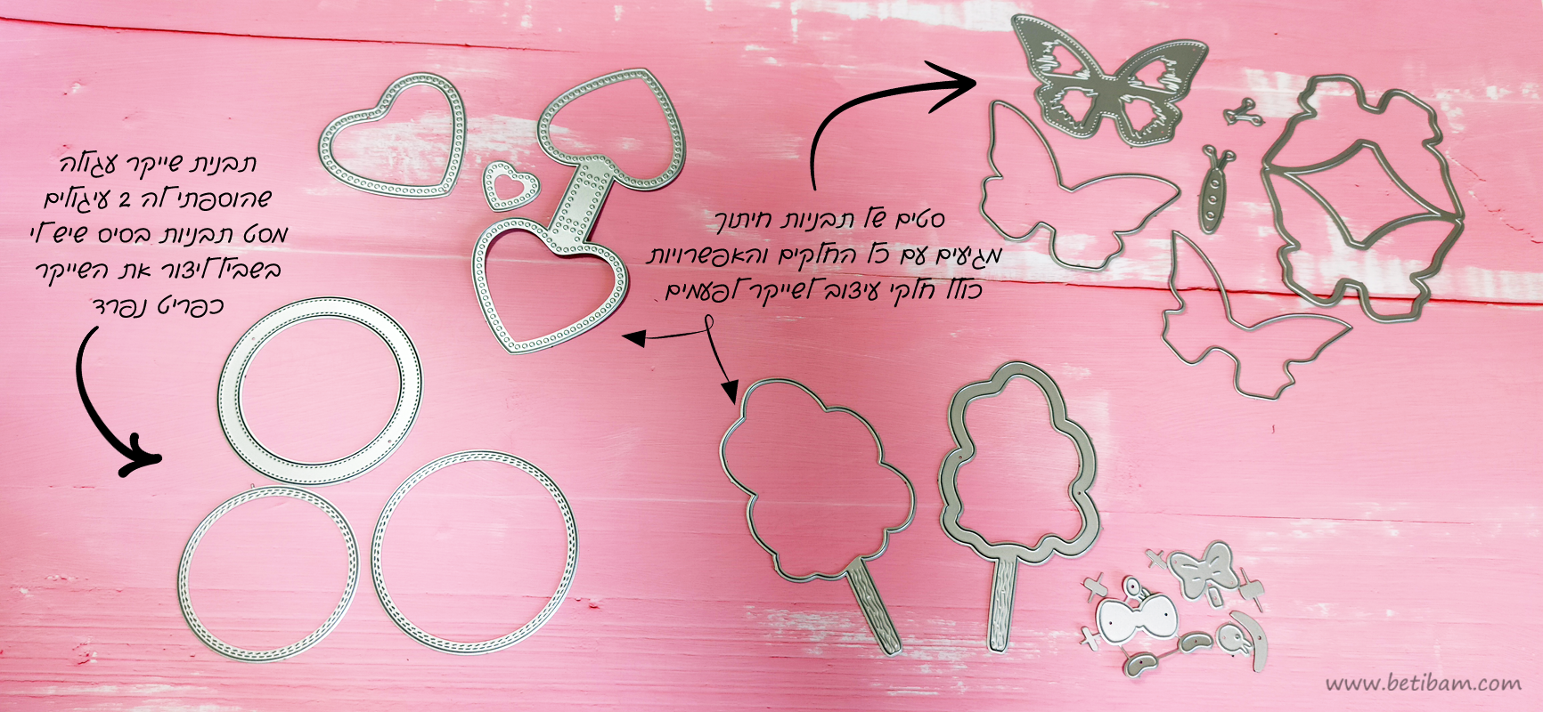 תבניות חיתוך - אני אוהבת להשתמש בתבניות חיתוך שמתאימות לביג שוט, או לחילופין אם יש לכם מכונה חשמלית (סילואט / קריקאט) יש גם להן אחלה תבניות. במידה ואין לא את זה ולא את זה, אפשר להשתמש בכל כלי שבעזרתו תוכלו ליצור את הצורה הרצויה. התבניות הפיזיות בדר"כ מגיעות בסט מותאם מראש שיש בו את החלקים הנדרשים או שניתן להכין את החלקים באמצעות תבניות בסיס קיימות, את רוב התבניות לביג שוט אני רוכשת בעלי אקספרס, הכי משתלם לטעמי.