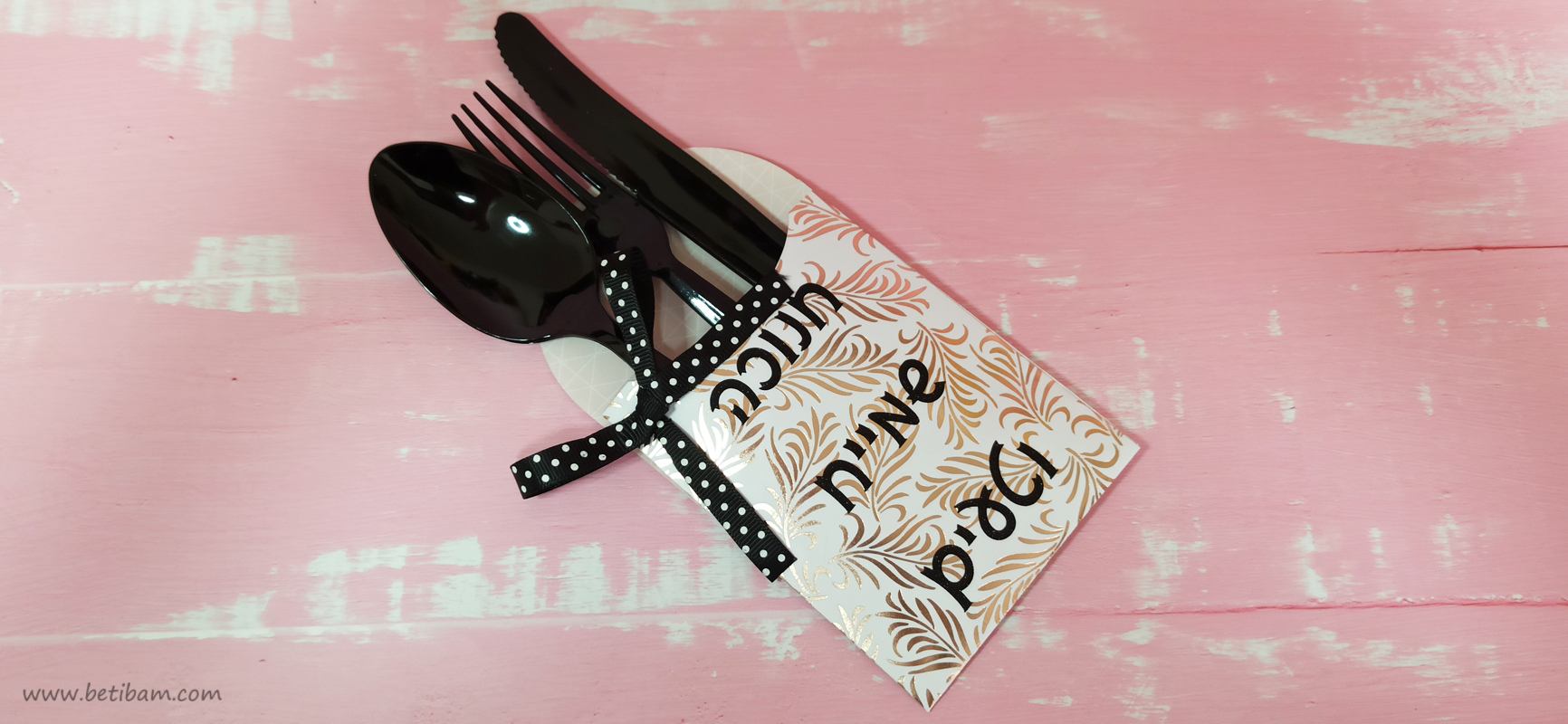 הכנתי מארז לסכו"ם מקארדסטוק מוטבע רוז גולד עם כיתוב ויניל שחור מנצנץ וסרט קטן