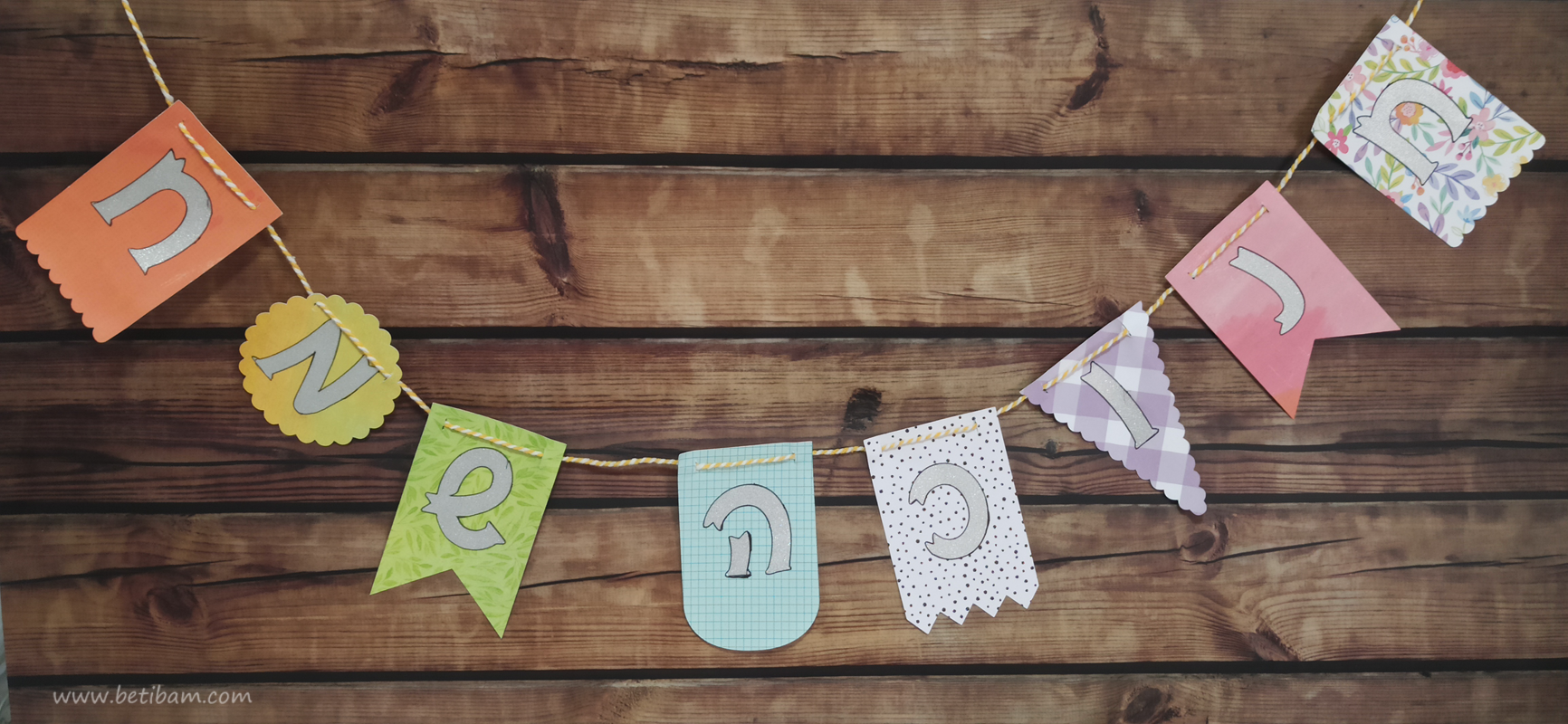 הכנתי במייקר שלי שרשרת דגלים בצורות שונות עם כיתוב בויניל כסוף מנצנץ במסגרת שחורה.
